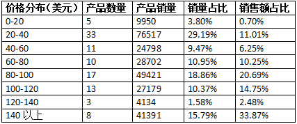 100款产品中,86款产品月销售额均在10000美元以上。其中有54款月销售额在50000美元以上;42款月销售额在100000美元以上;29款月销售额在200000美元以上;13款产品月销售额在500000美元以上,超过1000000美元的产品有3款。