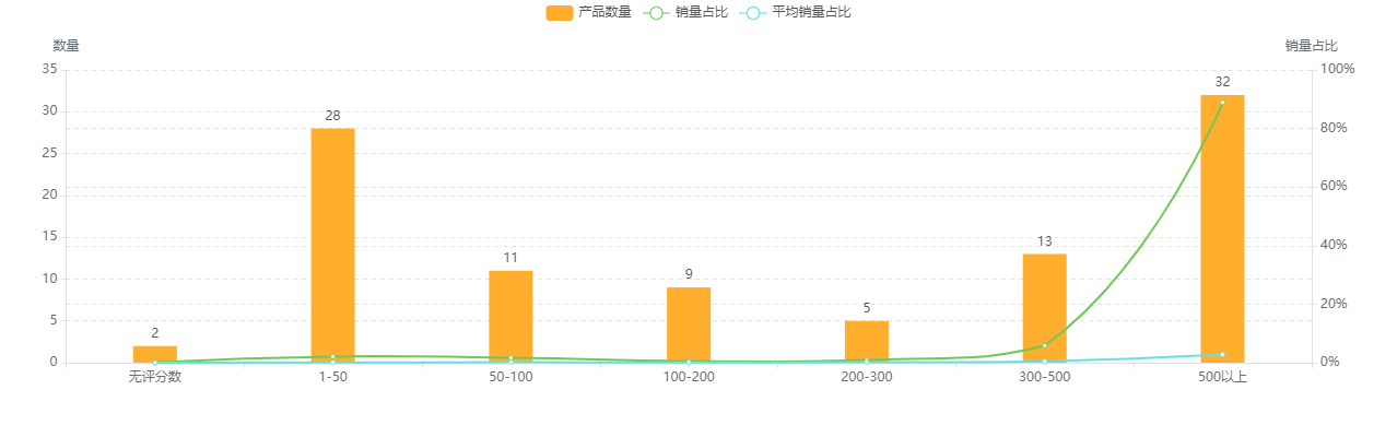 在100款产品中,评分数在500以上的有32款(月销量297641,占比88.86%),评分值在4.5分以上有11款(月销量8271,占比2.47%),39款产品评分值在4.3-4.5之间(销量262962,占比78.51%),21款产品评分值在4.0-4.3之间(销量54583,占比16.30%)。