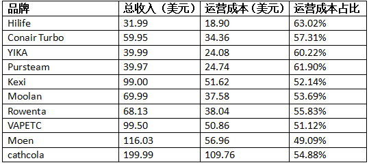 由表可知,该产品运营成本普遍在50%-65%左右。
