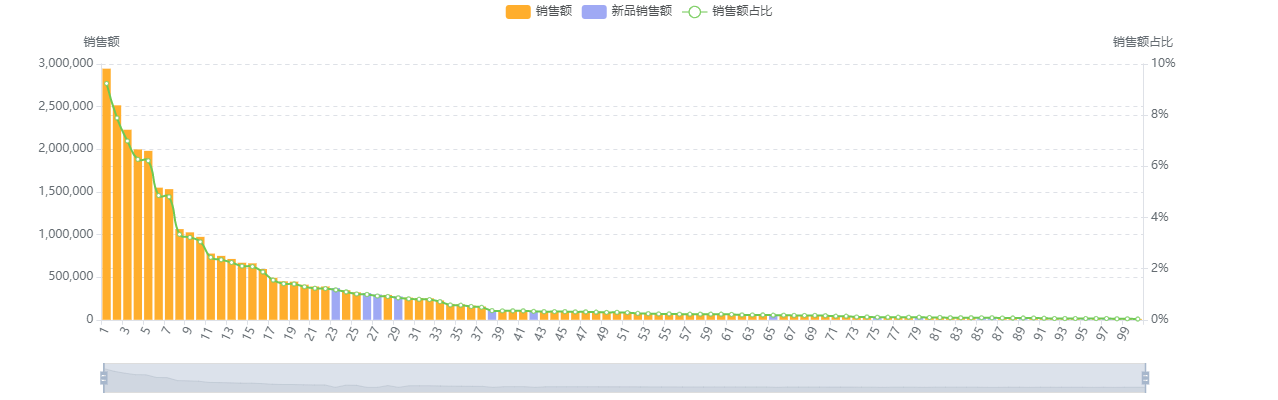 100款产品中有99款月销售额均在10000美元以上。其中有69款月销售额在50000美元以上;46款月销售额在100000美元以上;33款月销售额在200000美元以上;16款产品月销售额在500000美元以上,超过1000000美元的产品有9款。