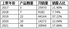 2020年和2021年分别上架20款和46款。