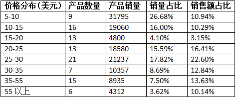 由图可知,产品平均价格26.36美元(新品平均价格为33.13美元),价格在25-30美元产品(21/100)以上占多数。