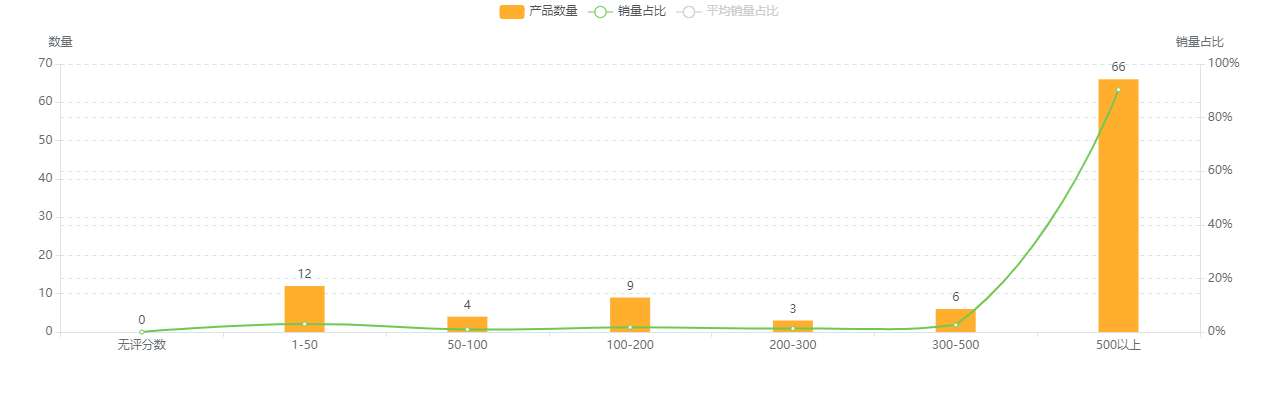 在100款产品中,评分数在500以上的有66款(月销量383849,占比90.42%),评分值在4.5分以上有57款(月销量289376,占比68.17%),31款产品评分值在4.3-4.5之间(销量123713,占比29.14%),2款产品评分值在4.0-4.3之间(销量1606,占比0.38%)。