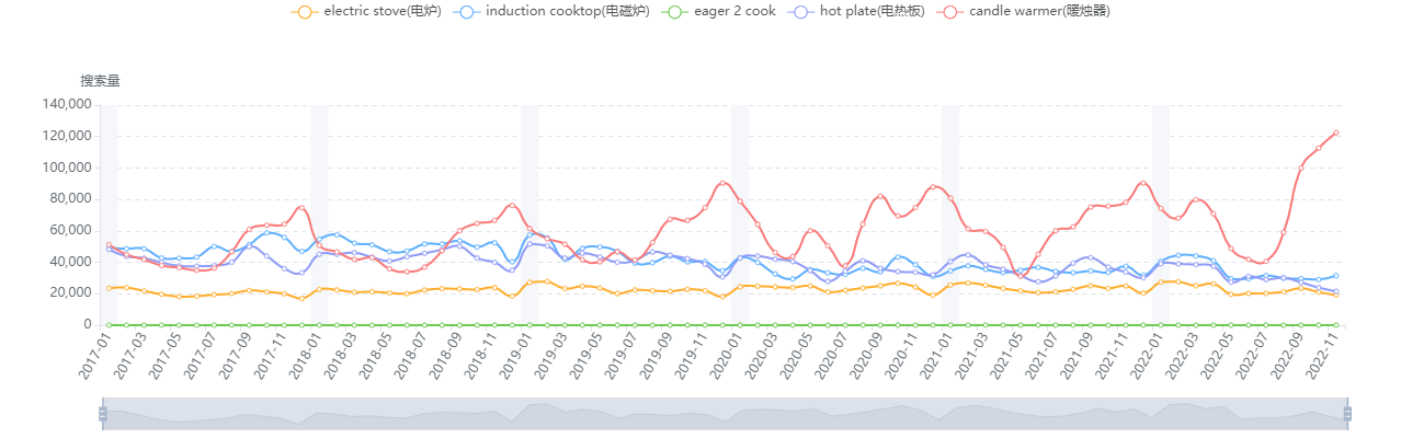 2017年以来相关关键词在Amazon的月搜索量如图所示:
