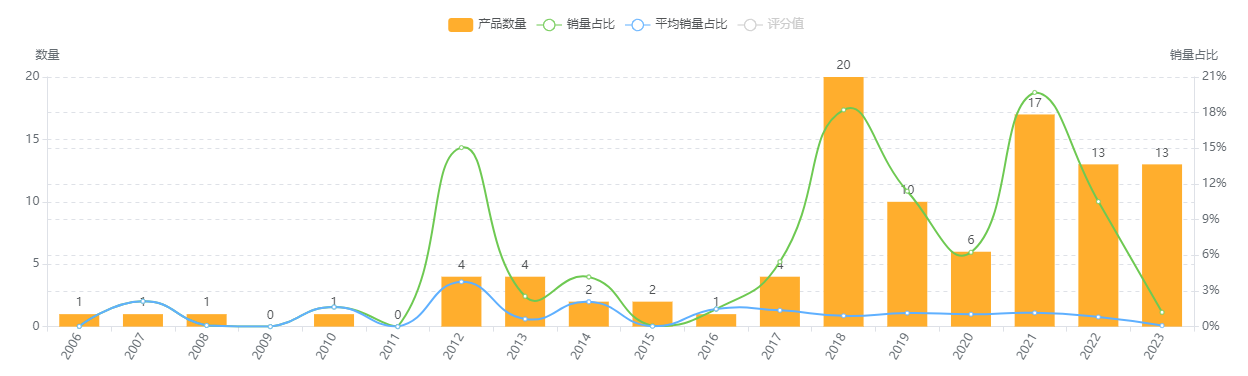 由图可知,产品在评分值高分区较多,市场比较稳定;同时评分值相对较低,产品存在较大可改进空间。