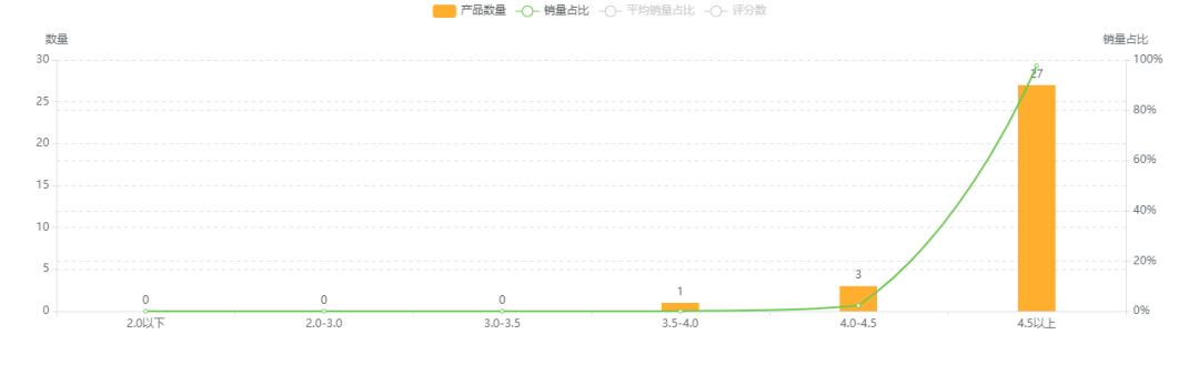 在31家卖家中,评分数在500以上卖家有19家(月销量46037,占比90.80%);评分值在4分以上,有30家,其中27家(月销量49558,占比97.74%)在4.5分以上。