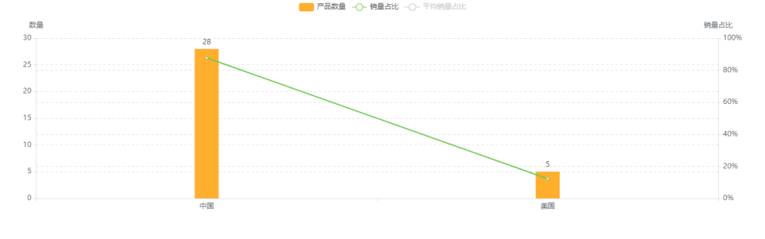 33款产品中,中国28款(月销量67515,占比87.75%);美国5款(月销量9446,占比12.25%)。